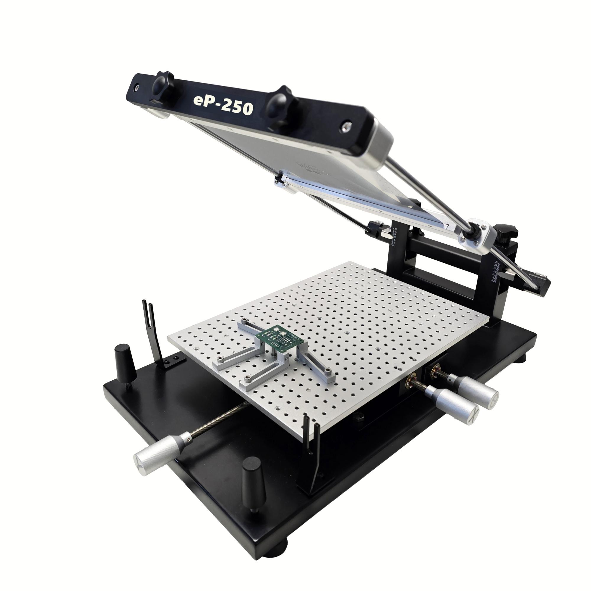 卓上手動はんだ印刷機ラインナップ 手動はんだ印刷機 ラインナップ 作業机上で専門知識不要の簡単操作でクリームはんだ印刷ができる、小型で分散設置可能なSMT実装用はんだ印刷機です。 プロフェッショナル 卓上はんだ印刷機 フレームレスはんだ印刷機 eP-1000 eP-250 多種サイズフレームステンシル対応 メタルマスクやフォトマスク利用可能 高精度位置合わせ機構 回転位置合わせ機構付属 フレーム高調整機構付属 両面部品実装対応 裏面支持金具付属 基板に合わせた自在サイズのシート状ステンシル使用可能 X・Y・θの微調整機能付属 両面部品実装対応 裏面支持金具付属 詳細 最大基板サイズ 250 x 400mm 最大フレーム 370x400mm 印刷テーブルサイズ 300x400mm 印刷面の高さ 0-80mm 位置合わせ幅 ± 5.0 mm 繰り返し精度 ± 0.01 mm 大きさ 540 x 380 x 390 mm 重さ 20Kg 最大基板サイズ 280 x 380mm 最小基板サイズ 10 x 5 mm 最大ステンシルサイズ 250 x 350mm 基板厚 0-20mm 繰り返し精度± 0.01mm 微調整範囲 X:±15mm Y:±15mm Z:±15mm 位置決めピン 1mm, 1.5mm, 2.0mm, 2.5mm, 3.0mm 大きさ 710 x 500 x 270mm 重さ 12Kg CIF社 はんだ印刷機 卓上はんだ印刷機 TECPRINTシリーズ 自動張力付万能フレーム付属 たわみ防止調整可能 回転位置合わせ機構付属 両面部品実装対応 裏面支持金具付属 標準型 ワイド印刷範囲型 TECPRINT 500 TECPRINT 700 最大基板サイズ 200 x 270 mm 最小基板サイズ 30 x 50 mm 裏面最大部品部品高 25 mm 位置合わせ幅 ± 7.0 mm 大きさ 315 x 550 x 200 mm 重さ 6 Kg 最大基板サイズ 300 x 400 mm 最小基板サイズ 30 x 50 mm 裏面最大部品部品高 25 mm 位置合わせ幅 ± 7.0 mm 大きさ 415 x 700 x 230 mm 重さ 9 Kg フレームレスはんだ印刷機 eP-250 詳細 シンプルでアルミフレームなし低コストのシート状ステンシル使用で、保管保守や取付が容易なフレームレスはんだペースト印刷機です。 X・Y・θの微調及び高さ調整など、高密度印刷に必要な機能をすべて備え、国内外の多くのメーカーが提供するシート状ステンシルに対応しています。 研究・教育現場に最適なはんだ印刷機です。 基板位置微調整: X,Y,Θ 印刷高さ調整 両面対応基板固定ピンホルダー