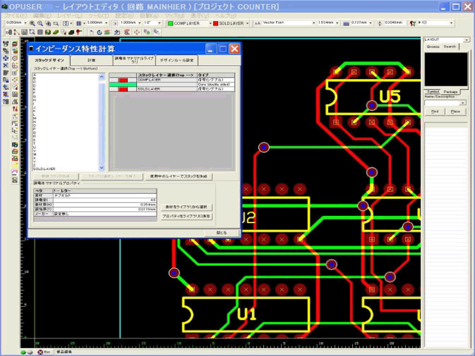 | レイヤ構造を設計し、レイヤタイプ( PWR / GND 、シグナルあるいは 混在 )を割り当て、導体層厚・絶縁層厚とパラメータなどを設定することにより、望むインピーダンスのストリップラインやマイクロストリップ配線の自動生成が可能です。 | インピーダンス計算配線![]() |
